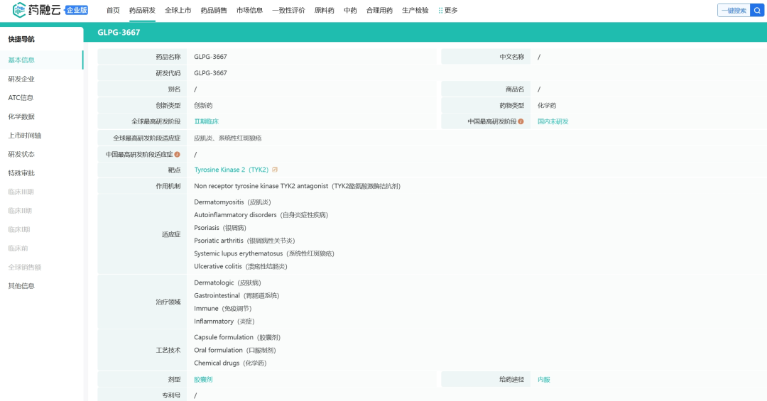 GLPG3667是一种研究性、新型、口服、可逆和选择性酪氨酸激酶2(TYK2)抑制剂,目前正在开发用于皮肌炎(DM)和系统性红斑狼疮(SLE),均进行到临床试验2期。2023年5月23日,Galapagos宣布针对皮肌炎的GALARISSO试验的首位患者已接受给药,这是一项随机、双盲、安慰剂对照、多中心研究,旨在评估GLPG3667的有效性和安全性。将在24周内对大约62名成年DM患者进行每日口服GLPG3667 150毫克或安慰剂的研究。如果获得批准,该药物有可能成为皮肌炎的第一个选择性口服TYK2抑制剂。2023年8月28日,针对系统性红斑狼疮的GALACELA试验的首例患者已随机分配,该试验是一项随机、双盲、安慰剂对照、多中心研究,旨在评估GLPG3667治疗成人活动性SLE的疗效、安全性、耐受性、药代动力学和药效学。