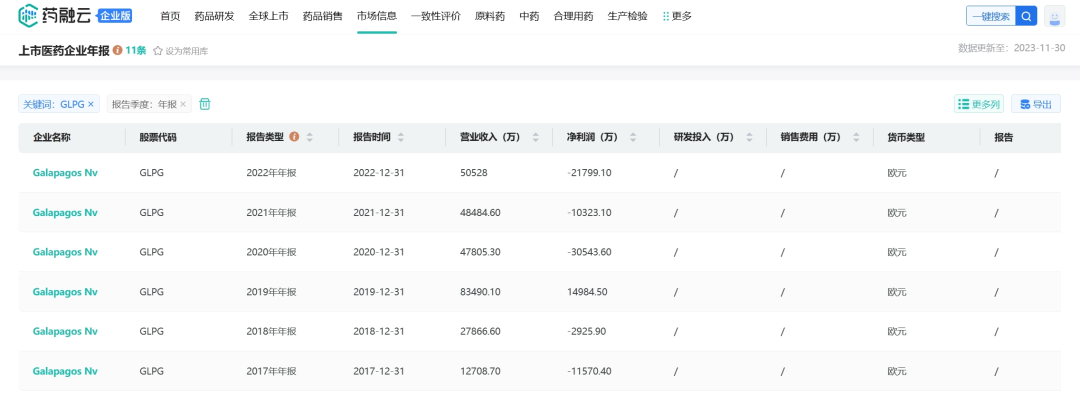 从药融云数据库获悉,虽然Galapagos在2020年之后推出了商业产品,但是相关的支出也在增多。目前整体的营收并没有那么乐观,2022年集团净收入为5.053亿欧元,运营亏损为2.675亿欧元,净亏损2.18亿欧元。