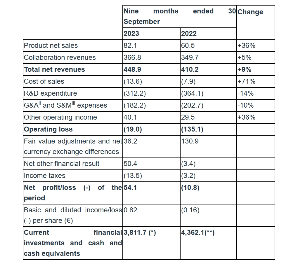 截止2023年9月30日的前三个季度Galapagos的总收入为4.489亿欧元,与上年同期相比增加了9%,包括Jyseleca在欧洲的净销售额8210万欧元,合作伙伴关系收入为3.668亿欧元。与Jyseleca净销售额相关的产品销售成本为1360万欧元;研发费用为3.122亿欧元,上年同期为3.641亿欧元,减少了14%;一般、销售和管理费用为1.822亿欧元;营业亏损总额为1900万欧元;截至2023年9月30日,当期金融投资以及现金及现金等价物为38.117亿欧元,而截至2022年12月31日为40.941亿欧元(不包括990万欧元的应收利息净收入),2023年前9个月现金和现金等价物以及流动金融投资共净减少2.824亿欧元。重申了Jyseleca 2023年全年净销售额指引为1.00~1.2亿欧元,2023年全年现金消耗指引为3.80~4.2亿欧元。