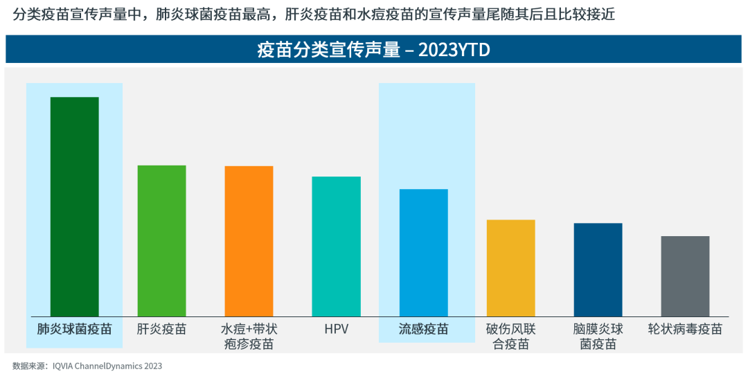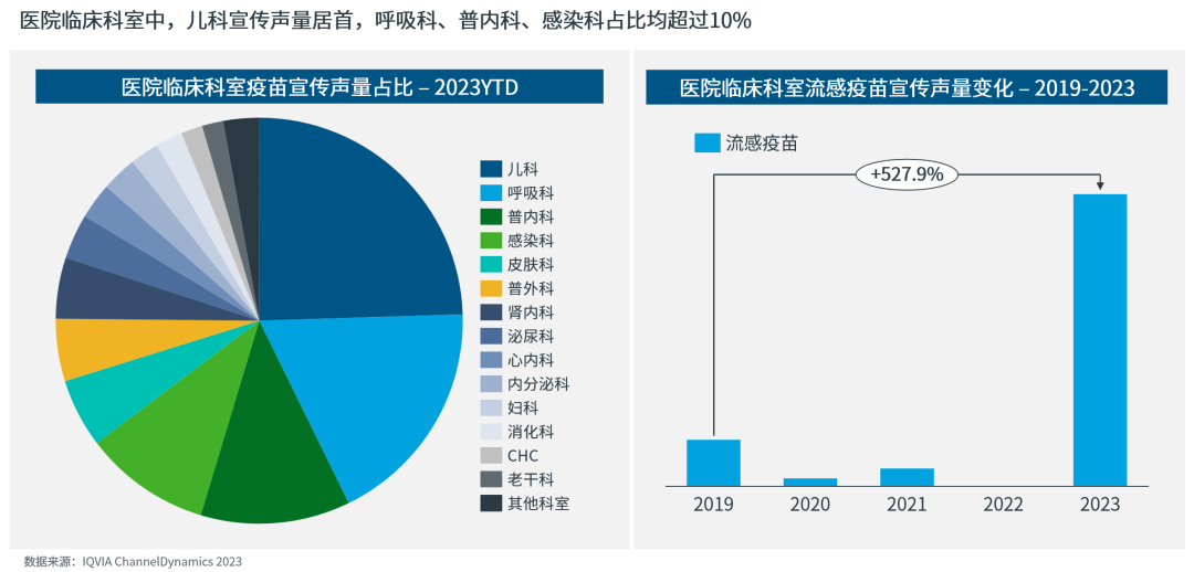 除了POV接种点外,我们还观察到疫苗的宣传工作在临床多个相关科室中也有部分声量,目前是POV接种点宣传声量的1/10。从IQVIA ChannelDynamics数据库中可以看出,2023年临床科室的疫苗宣传声量中,儿科仍然排名第一,体现出儿童疫苗宣传教育工作的前置与扩大。