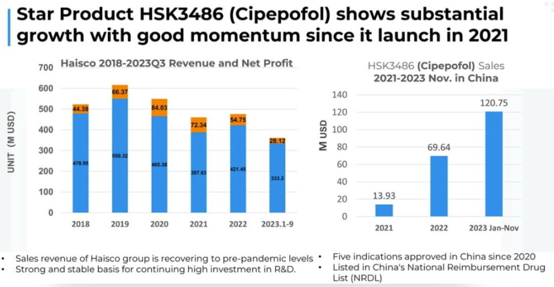 海思科的明星药物环泊酚(HSK3486)2022年销售额7000万美元,2023年前11个月销售额1.2亿美元。