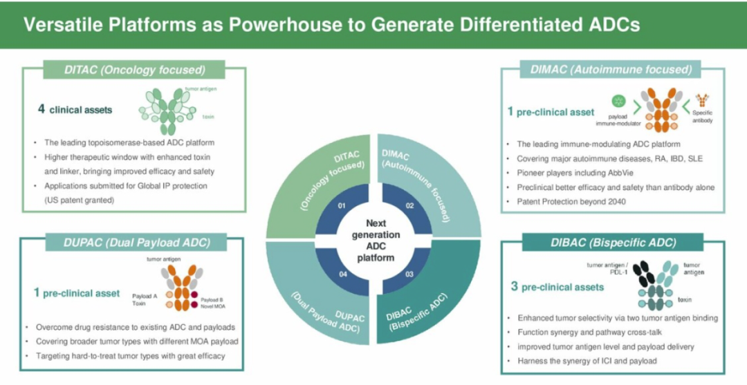 映恩生物同时布局更创新的ADC技术平台,包括双毒素的DUPAC、双抗ADC平台DIBAC、自免ADC平台DIMAC。