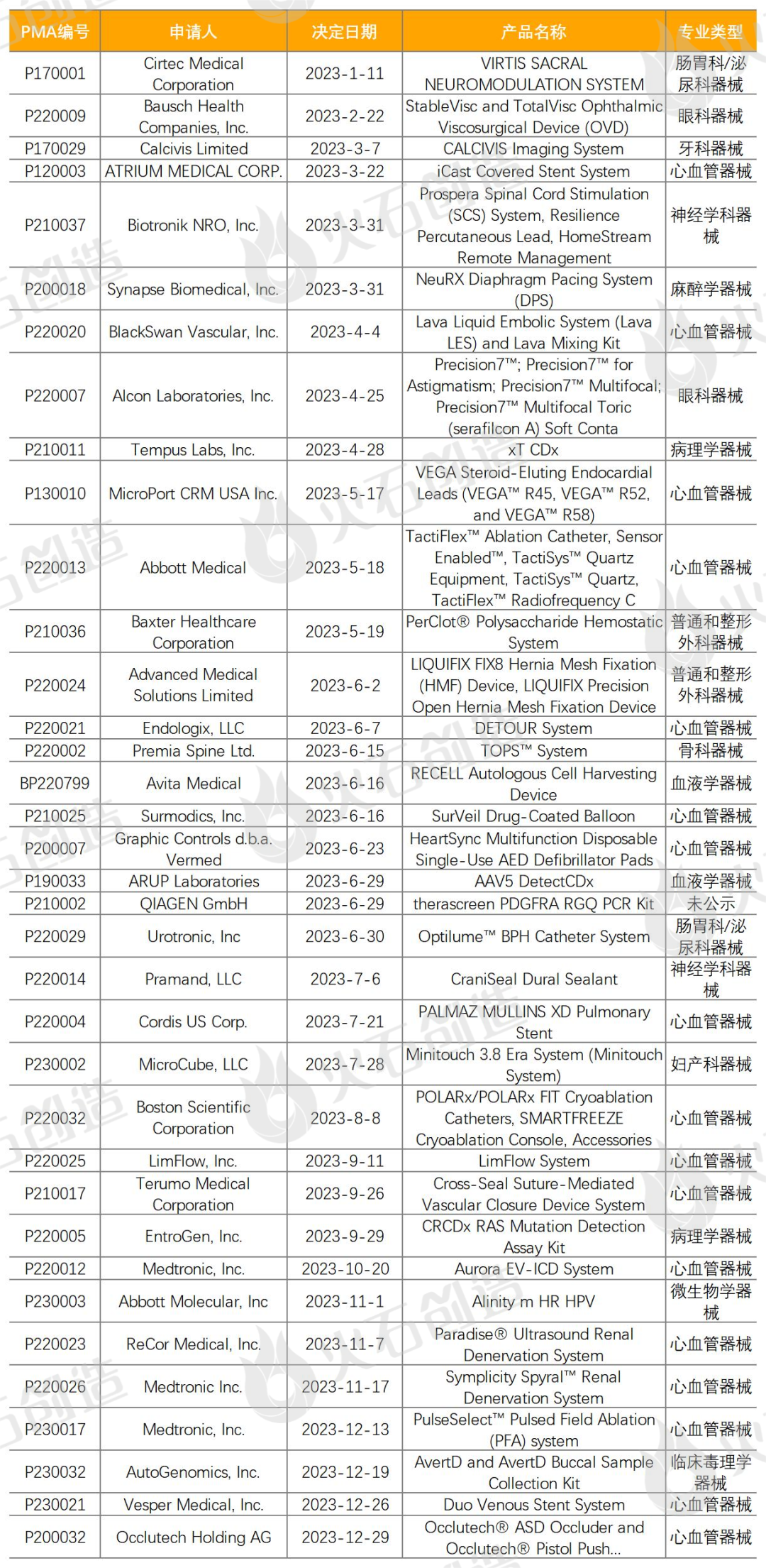 表1 2023年通过PMA首次批准的器械
