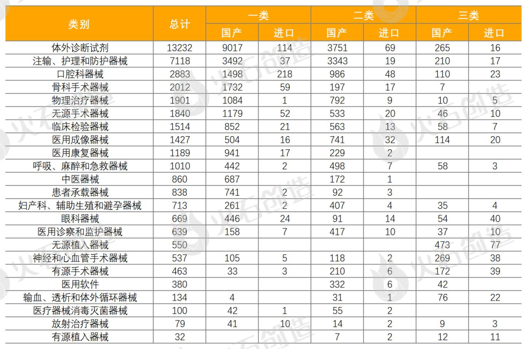 统计数据显示,体外诊断试剂数量最多,共13232项,占32.98%,基本上均为国产,为13033项。除体外诊断试剂,批准注册类别数量排前三位的分别为注输、护理和防护器械,口腔科器械和骨科手术器械。表4 2023年国产、进口医疗器械批准注册类别数目分布情况
