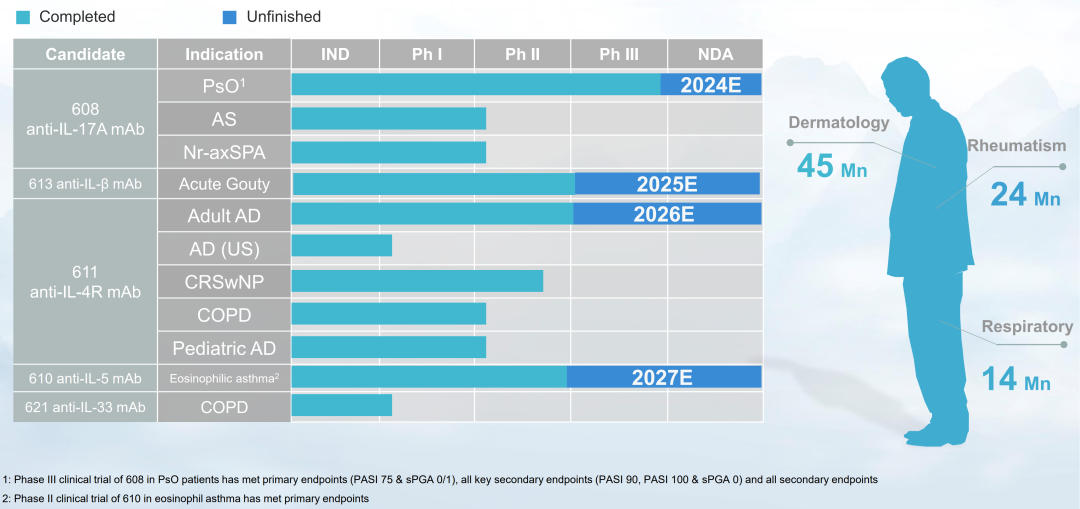三生制药处于国产自免第一梯队,主流自免靶点全布局,5款自免产品进度国内前三。611(IL-4Rα单抗)中重度特应性皮炎适应症研发进展国内居前,CRSwNP和COPD的Ⅱ期临床试验正在进行中,进度也国内居前。610(IL-5单抗)治疗哮喘同靶点国内进展第一,嗜酸性粒细胞哮喘适应症Ⅱ期临床入组完成,2023 年 1 月 4日宣布达到主要终点。613( IL-1β单抗) 研发进展同靶点国内第二 ,急性痛风性关节炎II 期临床试验达到主要终点。2024年起有望逐步提交IL-17A(2024E)、IL-1β(2025E)、IL-4R(2026E)、IL-5(2027E)NDA。