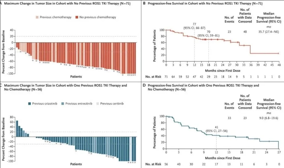发表在NEJM上的研究描述了开放标签、单组、注册性1/2期试验TRIDENT-1的试验结果。数据显示,在接受2期临床试验推荐剂量的患者中,TKI初治患者(n=71)中的客观缓解率(ORR)为79%(95% CI:68-88),中位缓解持续时间(mDOR)为34.1个月,中位无进展生存期(PFS)为35.7个月。