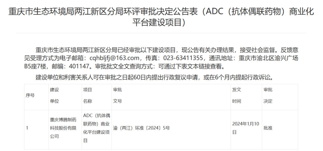 近日,根据重庆两江新区管理委员会官方网站的审批公示,重庆博腾制药科技股份有限公司(后简称“博腾股份”)将建设ADC(抗体偶联药物)商业化平台建设项目。