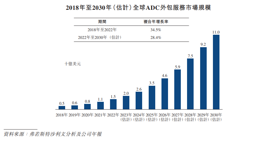2022年,全球ADC外包服务市场价值达到15亿美元,2018年至2022年的复合年增长率为 34.5%。这增长超过同期整体生物制剂外包服务市场的复合年增长率21.8%。预计到2030年全球 ADC外包服务市场将大幅扩张,达到110亿美元,2022年至2030年的复合年增长率为28.4%。