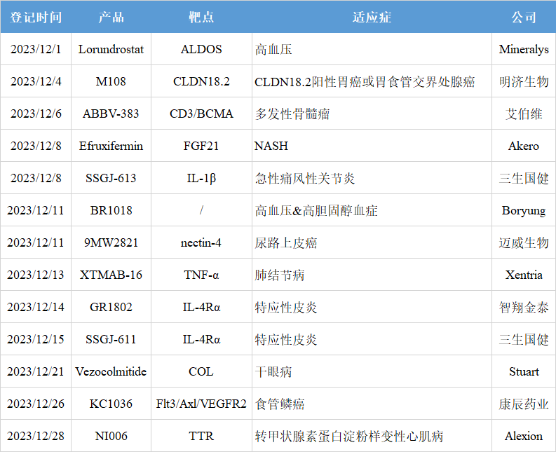 根据全球临床试验收录网站clinicaltrials和中国临床试验登记平台chinadrugtrials,12月共13款创新药进入III期阶段,其中6款来自中国药企。这些在研药物覆盖靶点不乏IL-4Rα、CLDN18.2、nectin-4等热门靶点,也包括ALDOS和FGF21这类新兴靶点。本文筛选其中5款重点产品加以介绍。