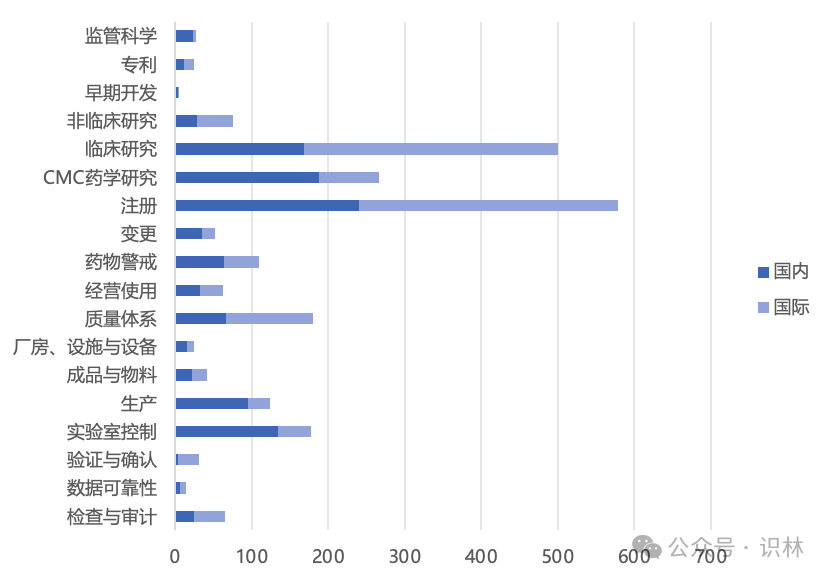 比较明显的区别是,中国药监在“CMC药学研究”、“实验室控制”、“生产”这类生产制造板块发布较多的法规指南,相比之下,国际药监重点在于“非临床研究”和“临床研究”这类研发阶段的内容。