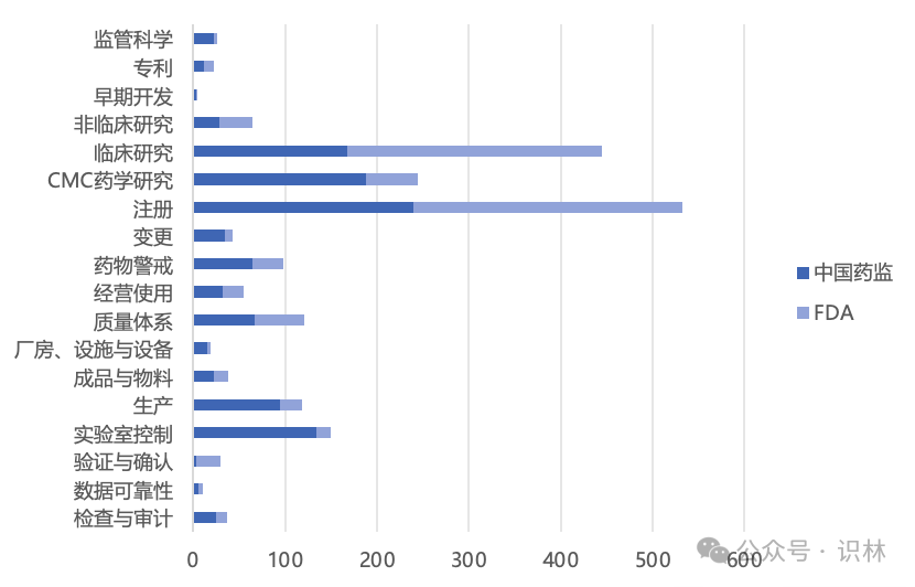 中外都比较关注的领域有“注册”、“质量体系”、“检查与审计”等。其中,与注册相关的内容尤其多,包括流程、资料、电子申报形式,也包括与变更相关的注册内容。