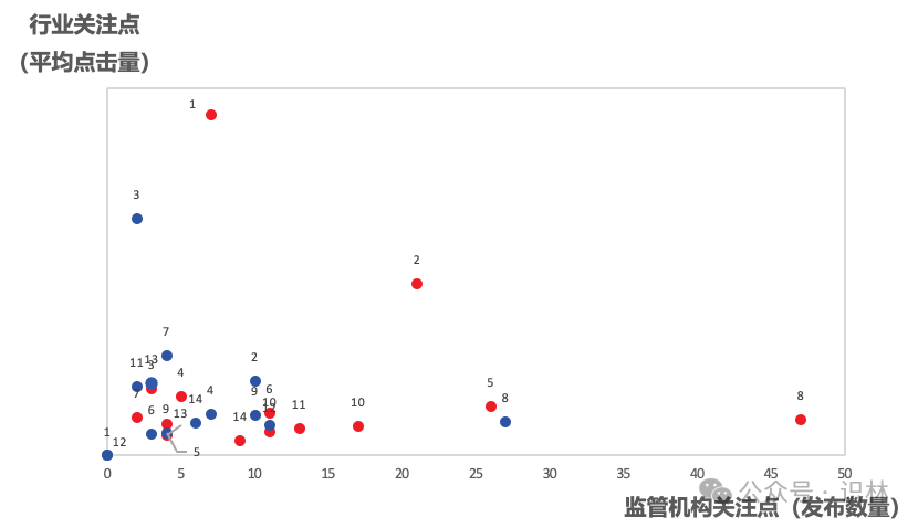 在这个坐标系中,横轴是该主题对应的法规指南的数量,纵轴则是全年平均点击量,且中美放在了一起(通过颜色区分),分别代表“监管机构关注度”和“行业关注度”。