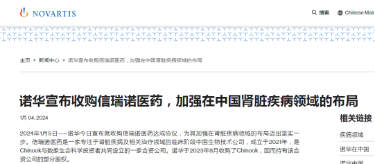 1月5日,诺华宣布达成收购信瑞诺医药的协议,信瑞诺医药整体并入诺华中国。这也是诺华首次对中国生物技术公司发起的正式收购。