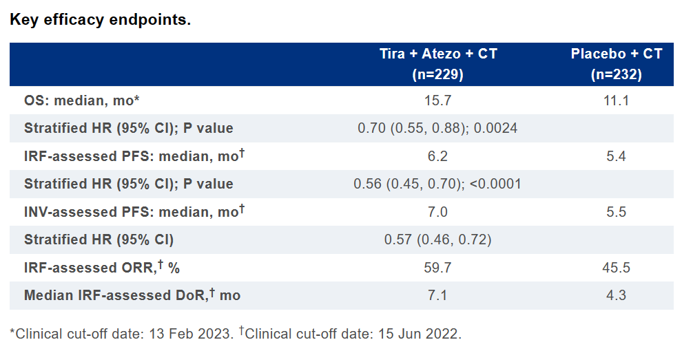 该研究是一项随机、双盲、安慰剂对照临床试验(n=461),评估了Tiragolumab+阿替利珠单抗+化疗对比安慰剂+化疗一线治疗不可切除的局部晚期、复发性或转移性ESCC患者的疗效和安全性。研究的主要终点为无进展生存期(PFS)和总生存期(OS)。