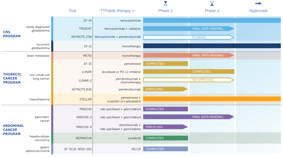 ▲Novocure公司肿瘤治疗电场开发布局(图片来源:Novocure公司官网)