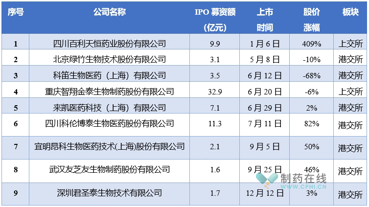 港股18A和科创板给未盈利生物医药企业的发展壮大提供了重要的融资途径,成为国内企业上市首选地。下表列举了9家公司上市时间、募资额、上市至今(1月12日)股价涨跌幅等信息。