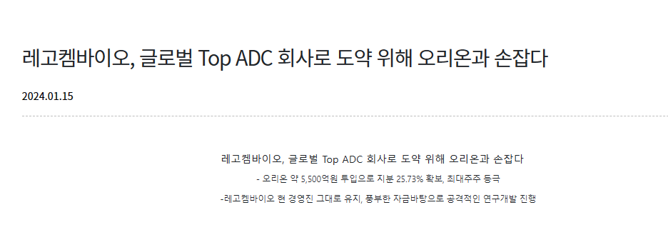 1月15日,LegoChem Biosciences宣布,Orion Group将以5500亿韩元(4.18亿美元)的价格收购LegoChem Biosciences 25.7%的股份,成为这家在科斯达克上市的生物技术公司的最大股东。