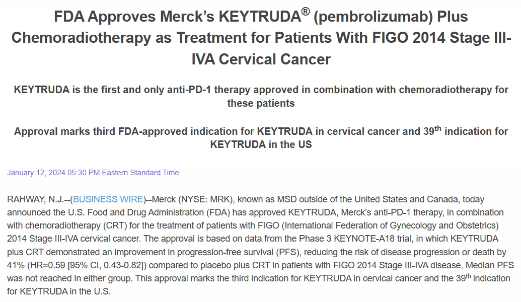 1月12日,默沙东宣布帕博利珠单抗(Keytruda,K药)获FDA批准用于联合同步放化疗治疗新诊断的III-IVA期宫颈癌患者,该产品成为了首款获批该适应症的PD-1药物。这也是K药在美国获批的第39项适应症。