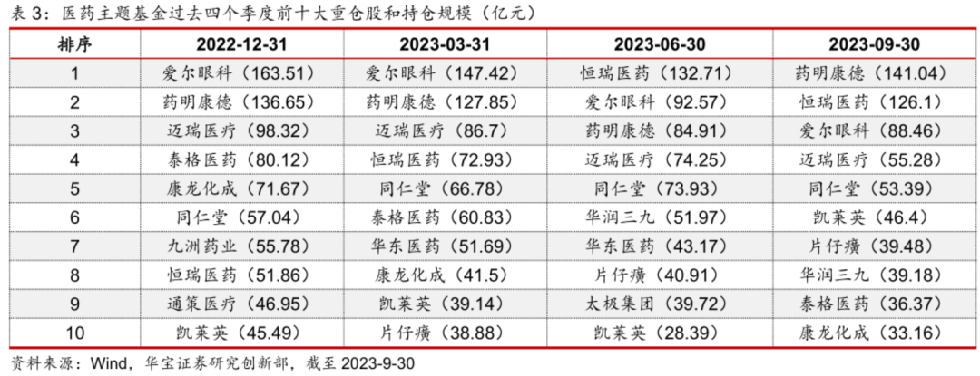 经统计,2023Q3医药主题基金前十大重仓股超过一半年初以来调整幅度小于10%超过50%(6家),其余4家调整幅度相对部分动则25%+的小票表现较好。