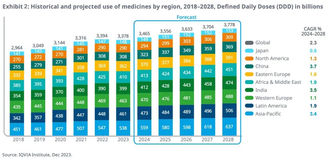 未来五年中,中国、印度和亚太地区的药品使用量增长最快,预计均超过3%的年复合增长率。