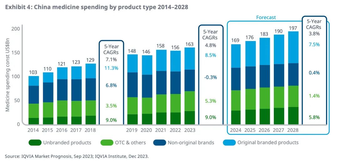 中国的药品支出已从2014年的1030亿美元上升到2023年的1630亿美元。过去五年中,支出增长主要由原研药推动,这些产品通常来自跨国公司,平均每年增长8.5%,原研药市场占比从2014年的20%上升到了2023年的29%。