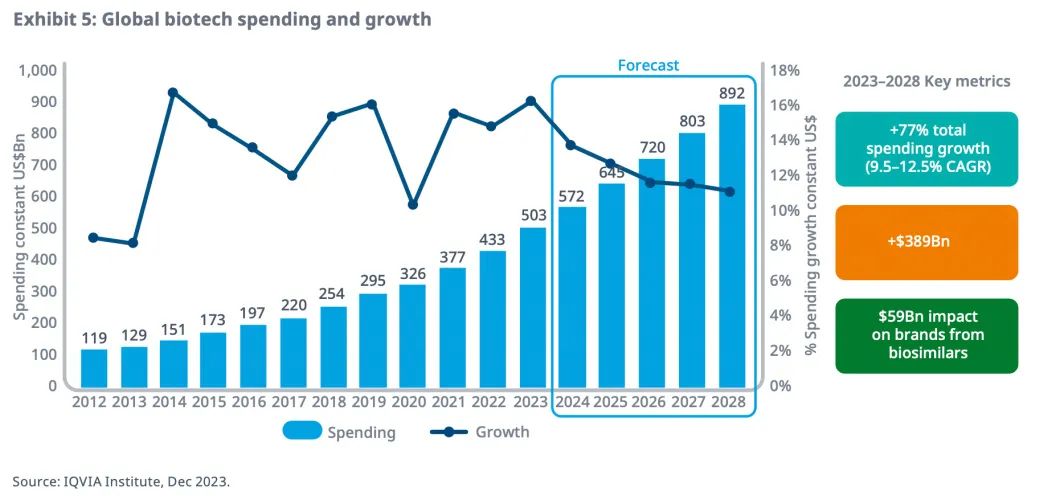 到2028年,预计全球生物药支出预计将达到8920亿美元,约占全球药物总支出的39%。