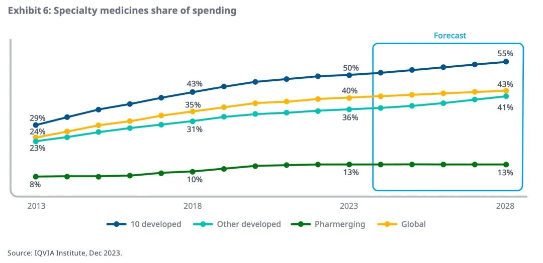 预计到2028年,全球特药将占药品总支出的43%,其中一半以上支出来自发达市场。
