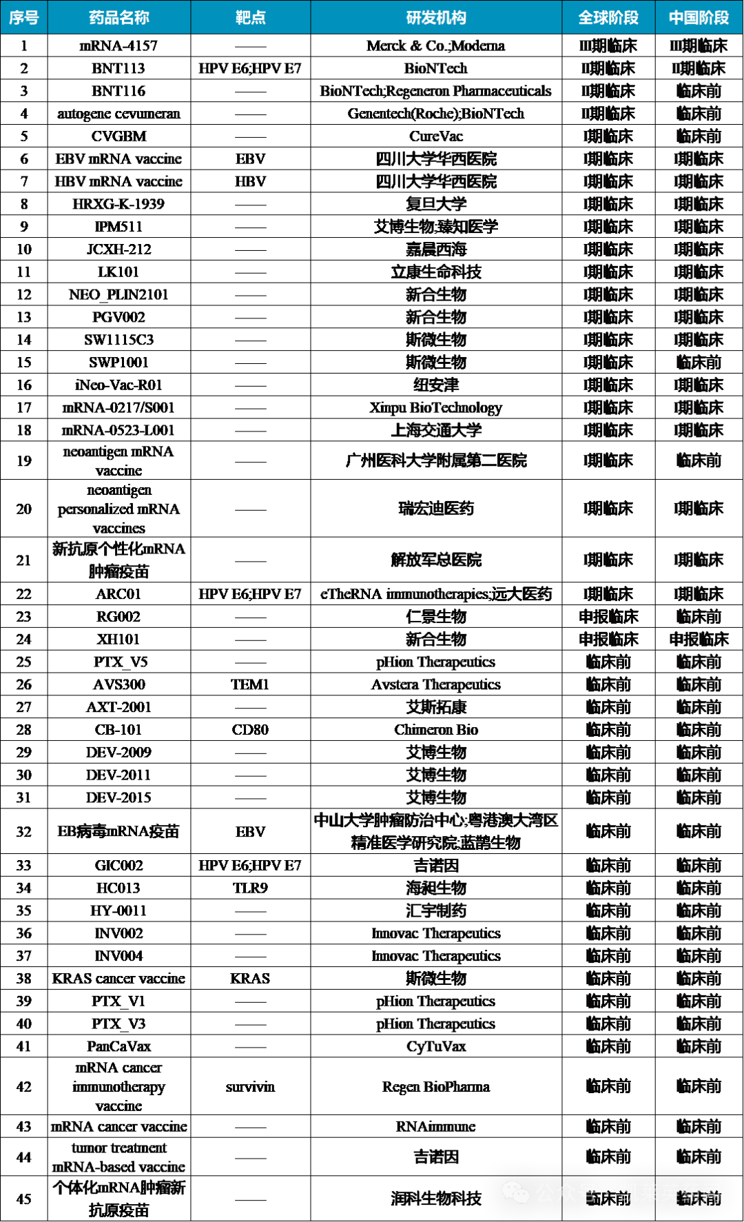 据不完全统计,目前在研的mRNA肿瘤疫苗约75种,其中治疗型疫苗约45种。
