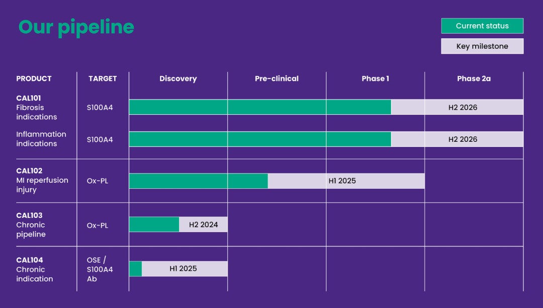 并入Calluna后,Oxitope此前研发的一种中和氧化磷脂的单克隆抗体成为管线“CAL102”,处于临床前阶段,只不过不再开发心血管适应症,而是关注氧化磷脂对于多种急慢性炎症和纤维化疾病的发生发展的作用。