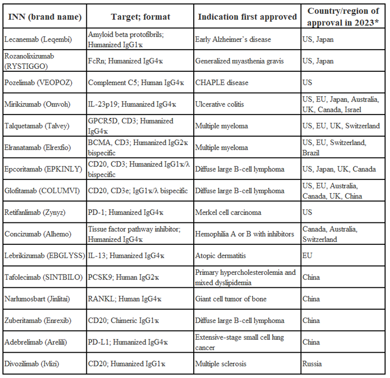 2023年同样是单克隆抗体药物获批的大年,截至2023年11 月 17 日,共有16个新的单抗类药物在2023年首次获得监管批准。其中有9个由FDA批准,5个由NMPA和EMA批准,4个在日本和加拿大获得批准。按治疗领域来看,则正好有一半用于癌症治疗,一半用于非癌症治疗。
