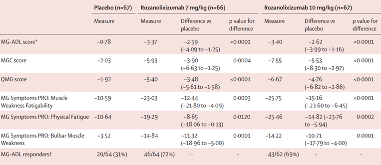 罗泽利昔单抗III期MycarinG 研究 (NCT03971422) 数据显示,第 43 天时,重症肌无力日常生活活动(MG-ADL) 评分相对于基线的变化具有统计学显着性差异,高、低剂量组均显现MG-ADL的大幅改善,相比基线变化值为–3.40与-3.37,安慰剂组为-0.78。