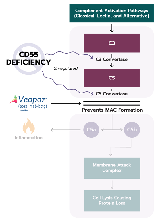 Pozelimab 是一种人源化 IgG4κ 单抗,靶向补体因子5 (C5),有助于预防补体途径介导的疾病。2023年 8 月 18 日,FDA 批准 pozelimab用于治疗患有CD55缺陷型蛋白丢失性肠病(CHAPLE)的儿童(>1 岁)和成人,是首款也是唯一一款专门针对CHAPLE病的药物。