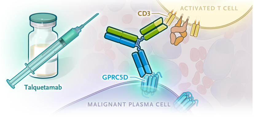 Elranatamab (Elrexfio™, PF-06863135) 是一种人源化 IgG2/双特异性 T 细胞接合抗体,靶向 T 细胞表面的 CD3 和 B 细胞成熟抗原 (BCMA),该抗原在骨髓瘤细胞表面高度表达。2023年8月14日,FDA 加速批准 elranatamab 用于治疗 RRMM 成人患者,这些患者之前至少接受过四种疗法,包括免疫调节剂、蛋白酶体抑制剂和抗 CD38 单克隆抗体。