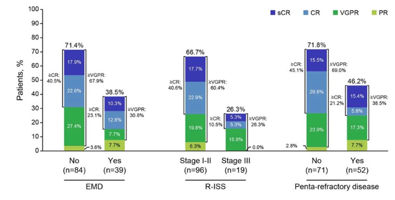 Talquetamab是一款first-in-class现货型双特异性T细胞结合抗体,能同时靶向MM细胞上的GPRC5D和T细胞上的CD3,是继BCMA的Tecvayli之后,第二个用于多发性骨髓瘤的双特异性抗体。于2023年 8 月获 FDA 加速批准上市,其获批基于一项 I/II 期 MonumenTAL-1 临床试验的结果。结果显示,405 μg/kg、800 μg/kg 两种不同剂量的 talquetamab 治疗分别达到 73.0% 和 73.6% 的总缓解率,CR 率分别为 35% 和 33%。