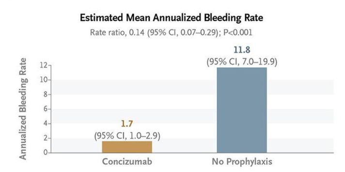 concizumab的疗效和安全性在III期Explorer7试验(NCT04083781)中进行了评估。共有133名患者入组,其中52名患者随机接受旁路药物按需治疗或concizumab预防治疗。另外81名非随机患者接受了concizumab治疗以评估总体安全性。结果表明,与接受旁路药物按需治疗的患者相比,接受concizumab治疗的患者的自发性和创伤性出血减少了86%。在concizumab预防组中(n =33),估计平均年化出血率(主要终点)较低,为1.7(95%CI,1.01-2.87),而按需治疗组为11.8(95%CI,7.03-19.86)(n =19))。