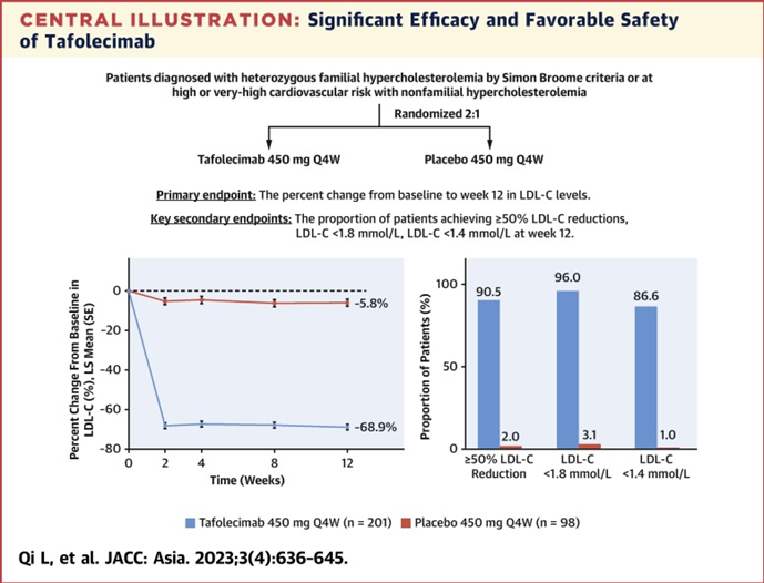 托莱西单抗(IBI306)三期临床研究结果显示,服用450 mg Q4W(每四周给药一次)托莱西单抗12周后,托莱西单抗组的LDL-C降低68.9%,安慰剂组的LDL-C降低5.8%,组间差异为63.0%。第12周时,托莱西单抗组90.5%的受试者的LDL-C水平降低50%及以上;此外,托莱西单抗组有96.0%的受试者的LDL-C降低至小于1.8 mmol/L,86.6%受试者的LDL-C降低至小于1.4 mmol/L。托莱西单抗还可以显著降低脂蛋白a。服用450 mg Q4W第12周后,托莱西单抗组的脂蛋白a降低45.4%,安慰剂组降低11.5%,组间差异为33.9%。