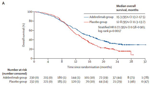 阿得贝利单抗的III期CAPSTONE-1研究(NCT03711305)的结果发表于TheLancetOncology,这项研究结果显示,与安慰剂联合化疗相比,阿德布雷利单抗联合化疗显着改善了患者的OS(中位15.3个月(95%CI13.2–17.5)vs12.8个月(11.3–13.7)),24个月时阿德布雷利单抗的OS率为分别31.3%,也显著优于对照组的17.2%。