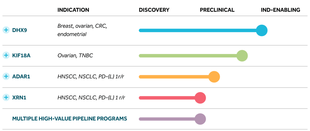 Accent正在为新的和已知的、但解决方案不理想的、高影响力的肿瘤靶点开发治疗方法,有可能使大量患者受益。该公司的DHX9抑制剂旨在解决高需求未得到满足的适应症,包括BRCA功能丧失癌症(乳腺癌、卵巢癌)、错配修复缺陷癌(dMMR)或微卫星不稳定性高(MSI-H)癌症(结直肠癌、子宫内膜癌、胃癌)和其他未公开的癌症类型。Accent的第二个主要项目,一种KIF18A抑制剂,也有可能使大量患者受益,包括卵巢癌和三阴乳腺癌(TNBC)。