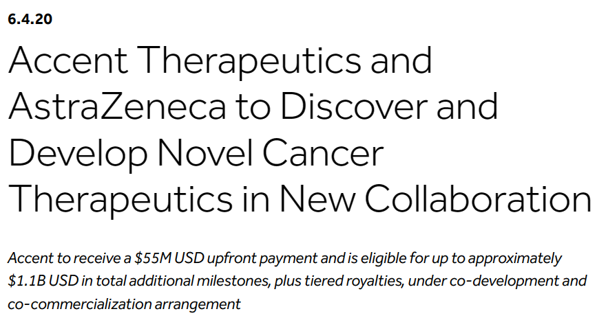 此前2020年Accent和阿斯利康建立了转化合作伙伴关系,以发现、开发和商业化某些靶向RNA修饰蛋白(RMP)的新型疗法,用于治疗癌症。该合作旨在通过将阿斯利康在开发新型肿瘤药物方面的良好记录与Accent在RMP靶向疗法的生物学、靶点识别和药物发现方面的行业领先专业知识相结合,快速推进并实现合作伙伴关系下令人兴奋的项目的丰富治疗潜力。Accent获得5500万美元的预付款,并有资格根据共同开发和共同商业化安排获得总计高达约11亿美元的额外里程碑,外加分级版税。