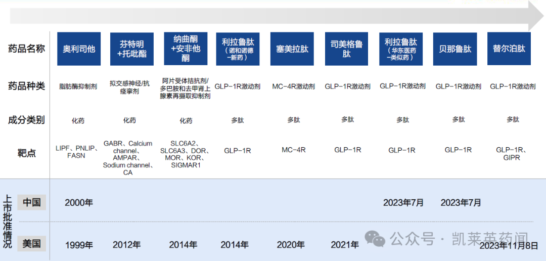 肥胖应对措施主要分为生活方式干预、减重代谢手术、减重药物治疗3种,减重药物治疗由于效果好、见效快、患者心理易接受等优势逐渐成为主流。此前,多款药物因安全问题被禁用,GLP-1成为最新的发展重点。