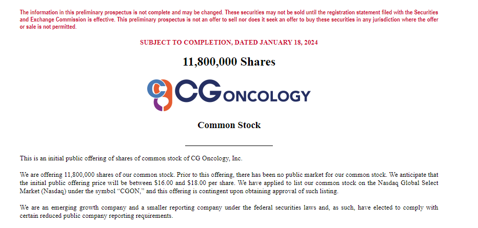 CG Oncology 的首次公开募股规模远超其上周的预期,根据1月18日美国证券交易委员会(SEC)文件,CG Oncology 表示将以每股16至18美元的价格发售1180万股股票,这将获得1.81亿美元的净收益。