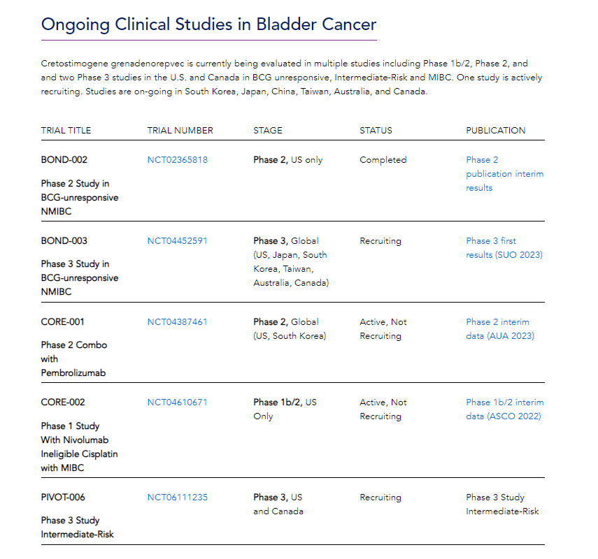 cretostimogene是一种经静脉内给药的靶向溶瘤免疫疗法药物,目前正在进行两项三期试验,用于治疗卡介苗无反应性和中风险非肌层浸润性膀胱癌(NMIBC)疾病。此外,该药还与 pembrolizumab联合用于相同适应症的二期研究。其他类型的膀胱癌也在接受cretostimogene与 nivolumab联用的评估。