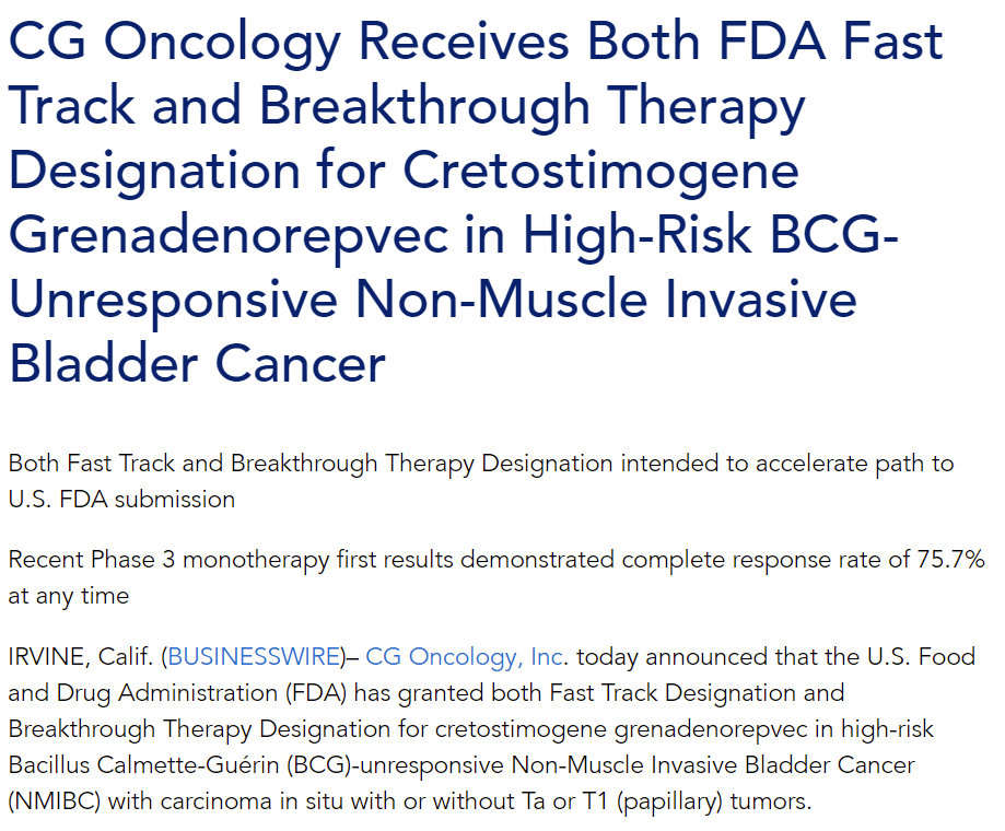 2023年12月5日,CG Oncology宣布溶瘤病毒cretostimogene治疗高危、卡介苗无应答NMIBC同时获得FDA的突破性疗法认证和快速通道资格。