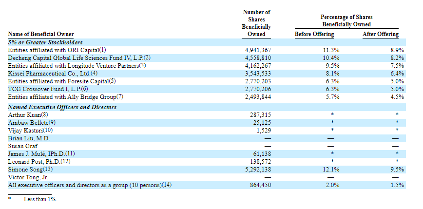 CG 公司的前身是2010年成立的Cold Genesys公司。多家公司持有CG Oncology 5%以上的股份:ORI Capital持有11.3%,Decheng Capital持有10.4%,Longitude Venture Partners持有9.5%,Kissei Pharmaceutical持有8.1%,Foresite Capital持有6.3%,TCG Crossover持有 6.3%,Ally Bridge Group持有5.7%。