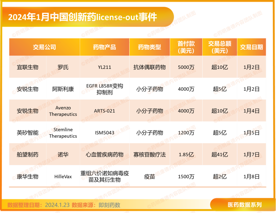 继去年12月百利天恒的84亿美元对外授权交易之后,中国创新药license-out热度持续上升。2024开年以来,至少已达成对外授权交易6笔,披露总金额超75亿美元,数量跟去年最火热的11、12月不相上下。引人注目的是,1月7日,成立仅3年的舶望制药达成总额超41亿美元的license-out,为中国小核酸药物领域添上了浓墨重彩的一笔,也将1月创新药对外授权市场推至一个新的高潮。其他值得关注的亮点包括: