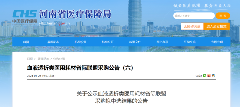 1月24日,河南省医保局发布《关于公示血液透析类医用耗材省际联盟采购拟中选结果的公告》。
