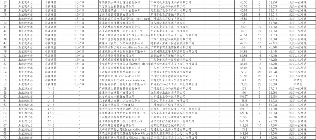 血液透析器(高通量)报价区间在54.5元-77.8元,降幅区间为40.15%-58.08%;血液透析器(非高通量)报价区间在36元-56.99元,降幅区间为40.01%-62.11%。