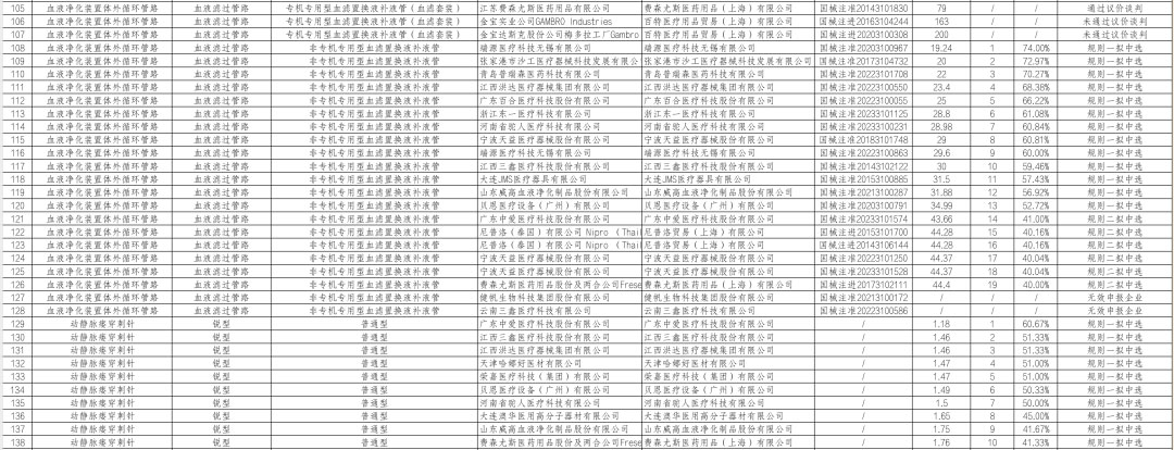 血液净化装置体外循环管路(血液透析管路)报价区间在11.5元-14.4元,降幅区间为40%-52.08%;血液净化装置体外循环管路(血液滤过管路-非专机专用型血滤置换液补液管)报价区间在19.24元-44.4元,降幅区间为40%-74%;血液净化装置体外循环管路(血液滤过管路-专机专用型血滤置换液补液管(血滤套装))为议价谈判产品,通过议价谈判的产品报价区间在30.88元-79元。