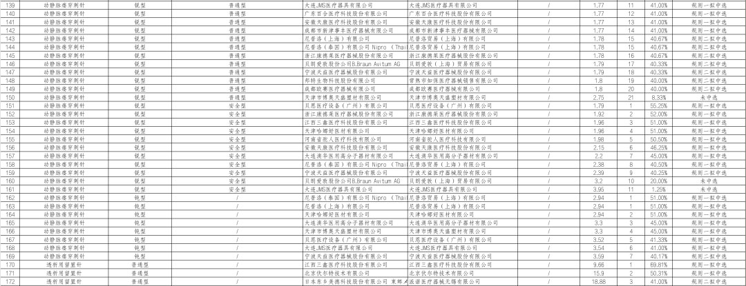 动静脉瘘穿刺针(钝型)报价区间在2.94元-3.59元,降幅区间为40.17%-51%;动静脉瘘穿刺针(锐型-普通型)报价区间在1.18元-1.8元,降幅区间为40%-60.67%;动静脉瘘穿刺针(锐型-安全型)报价区间在1.79元-2.39元,降幅区间为40.25%-55.25%。