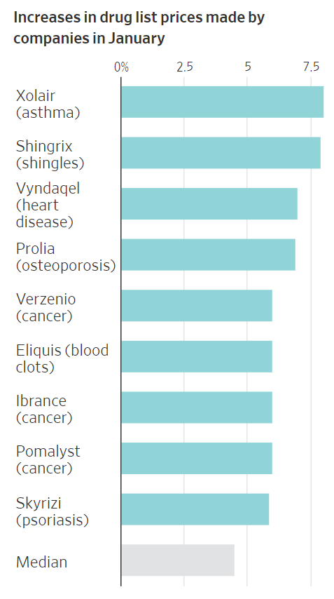 图1. 2024年1月季美国药物标价涨幅示意图。(数据来源:46brooklyn Research, Evaluate Ltd.;图片来源:The Wall Street Journal)
